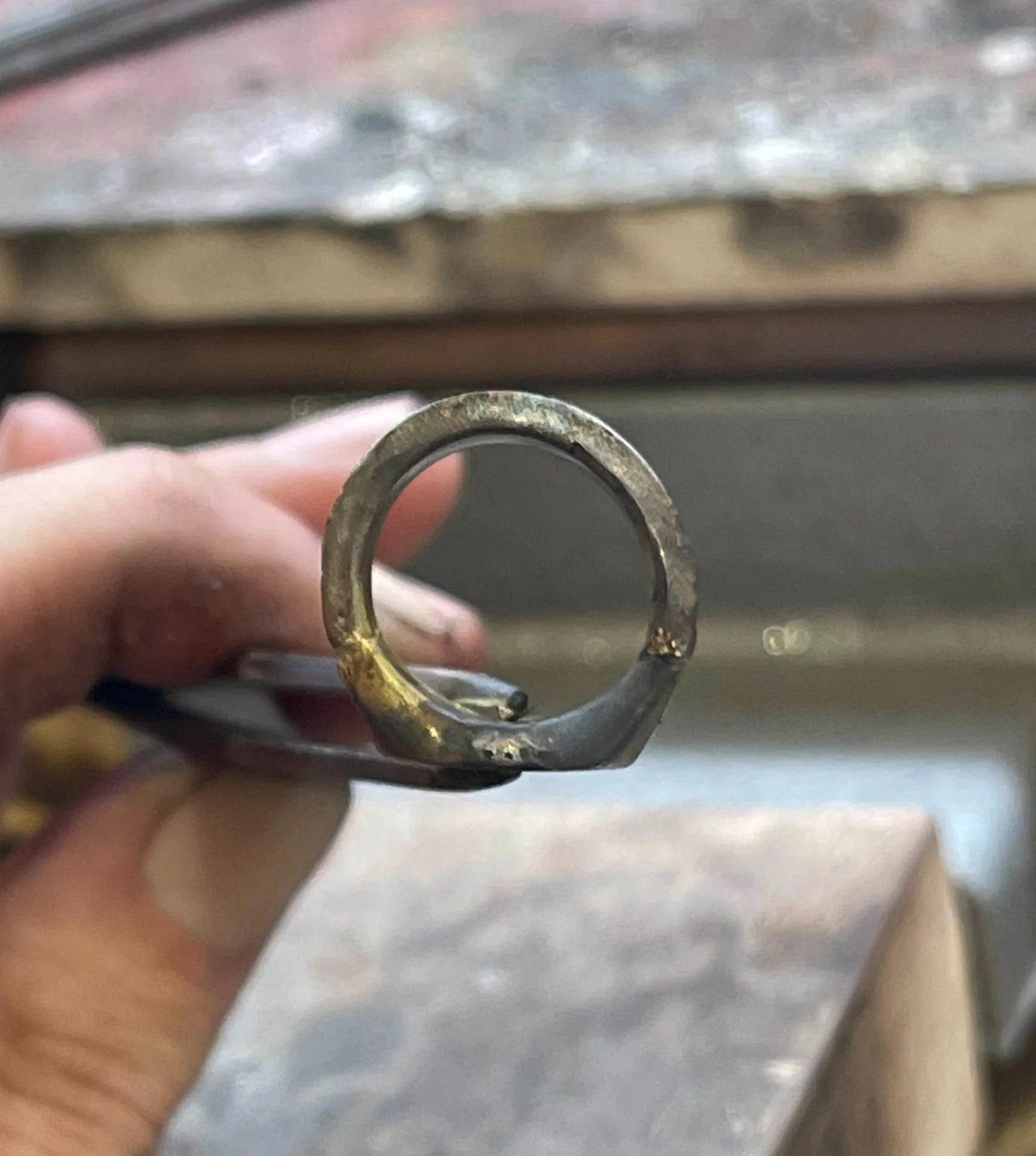 The process of reshanking a ring: Firstly you remove the old worn shank and create a piece of metal the same width and thickness as the thickest part on the shoulder, shape the metal to be the same size as the head of the ring and solder, shape up, file, and polish. Easy Peasy.